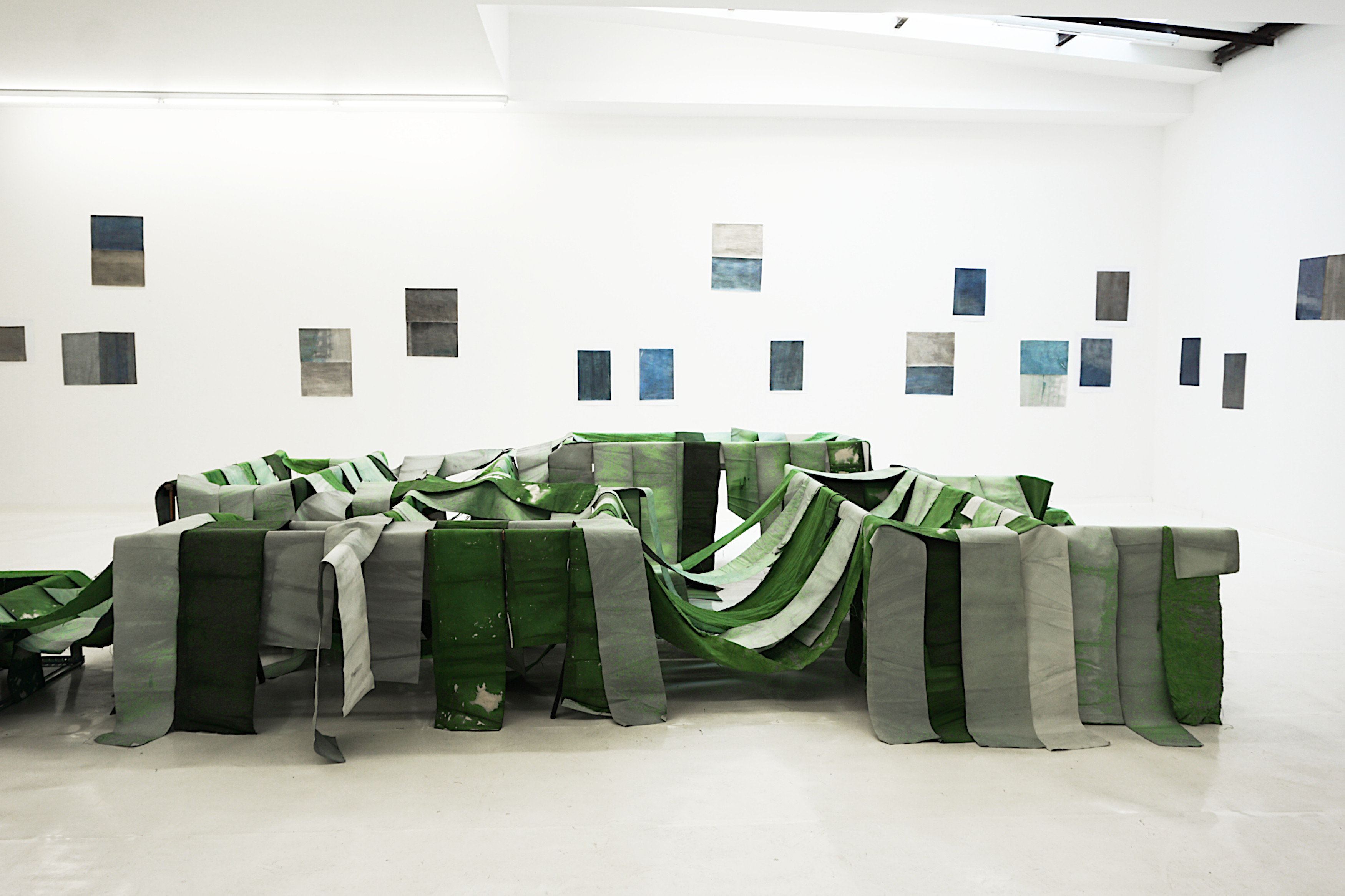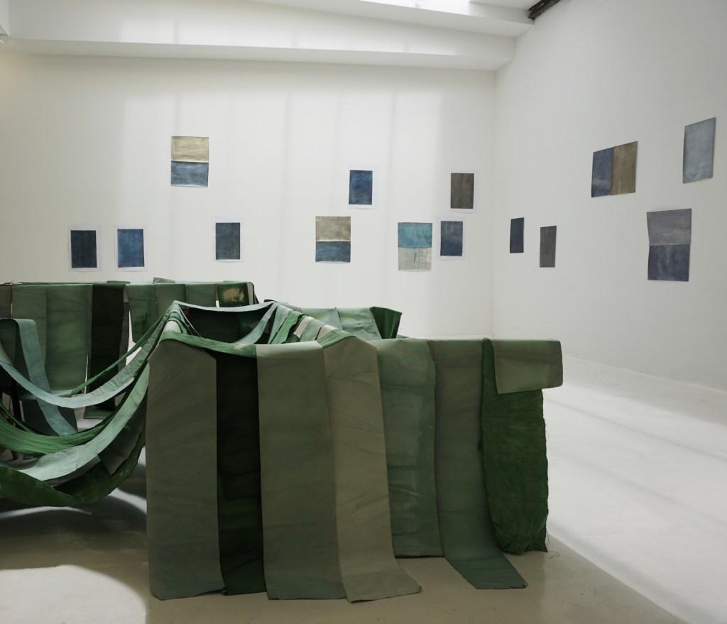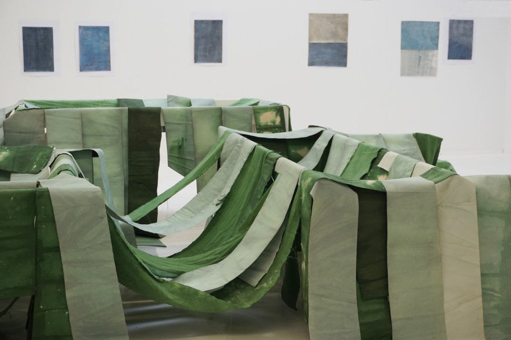 Mulden, Projectspace Berlin 2022 , gefärbte Nesselbahnen, Holzgerüst, Maße variabel / 30 Lichtnotate, Acryl auf Papier
